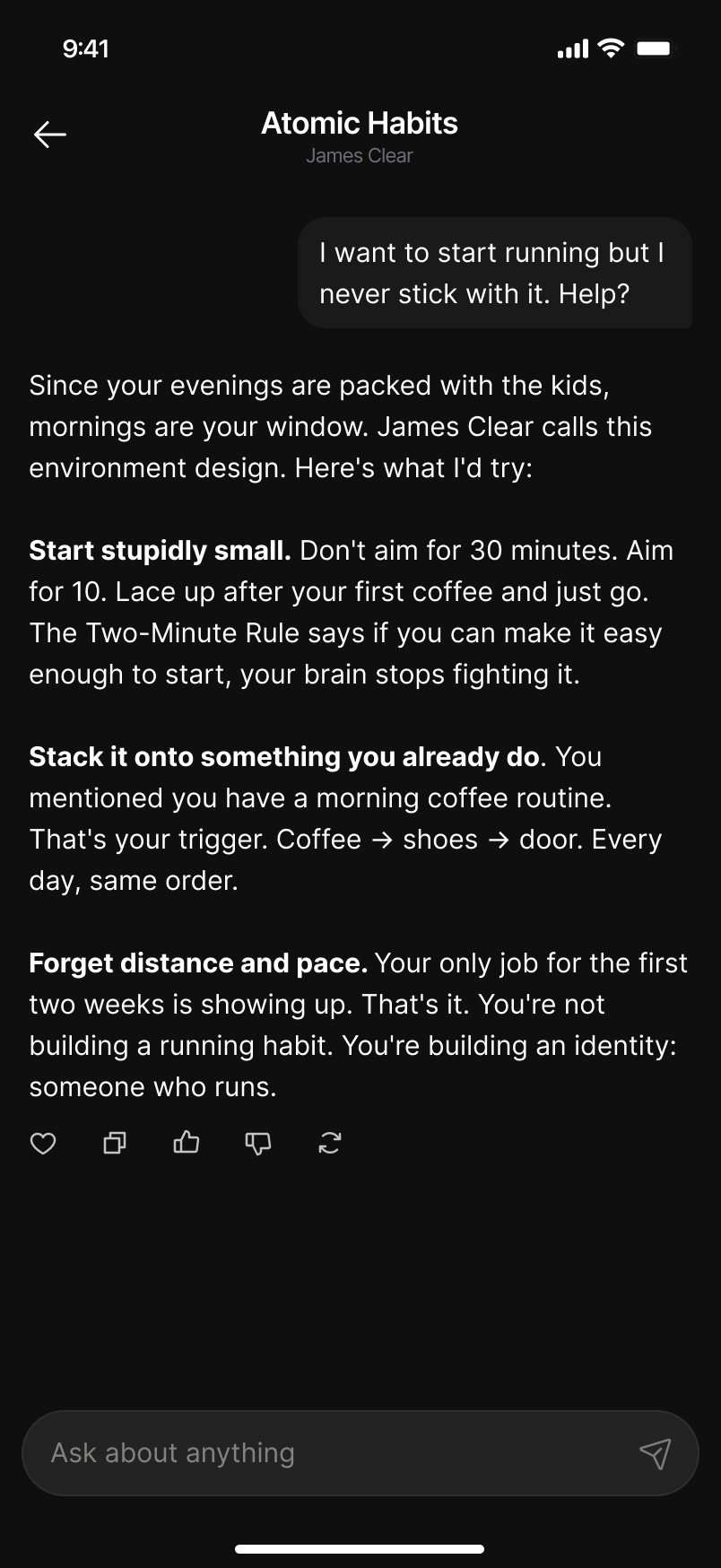 "I've read hundreds of books and barely applied any of them. The first time I chatted with a book on Superbook and it gave me advice based on my actual situation, I knew this was the missing piece."